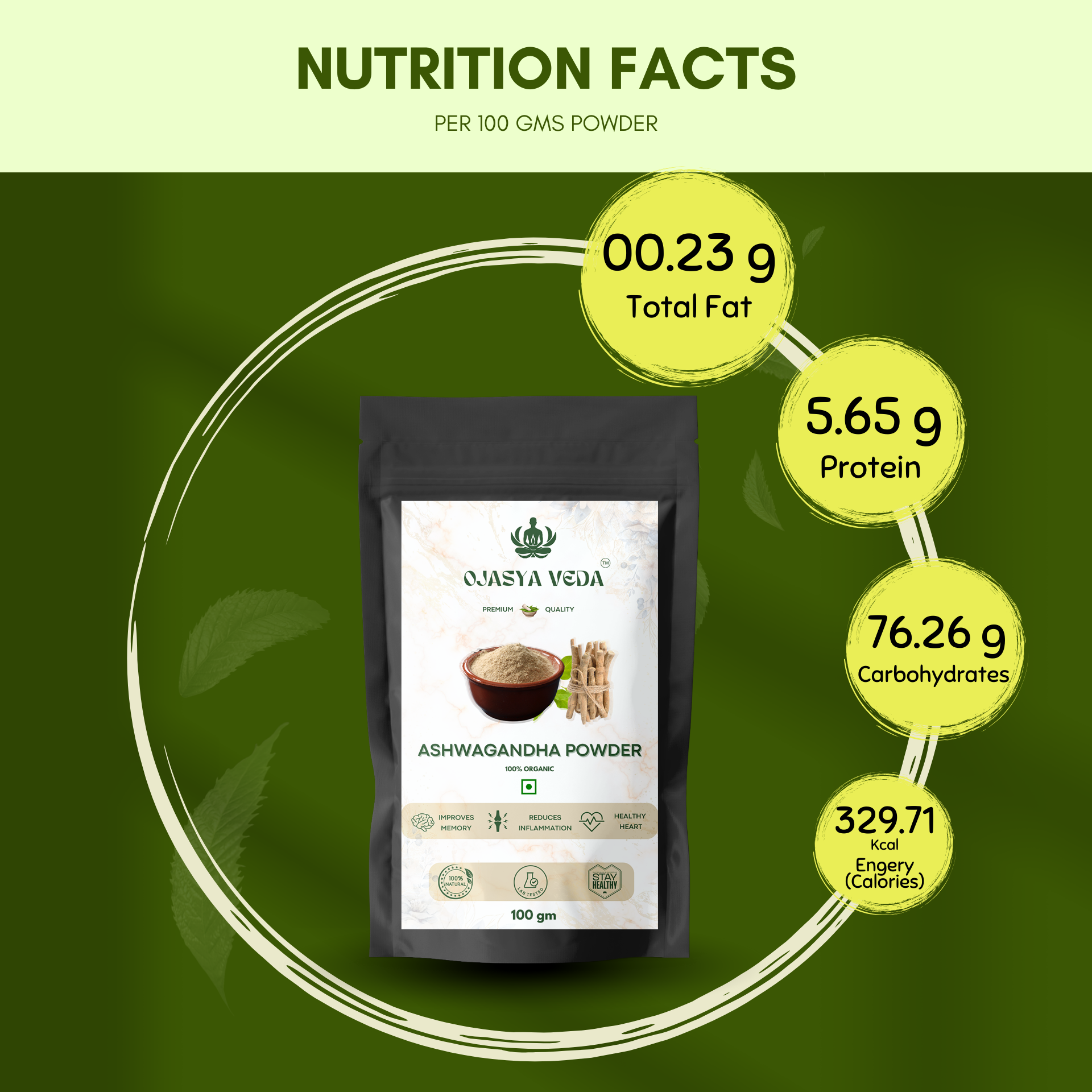 Ojasya Veda Ashwagandha Powder is a potent adaptogenic herb known for reducing stress, boosting energy, improving sleep, supporting immunity, and enhancing brain function. Our Ashwagandha is sourced from the finest farms, shade-dried, and ground using traditional techniques to maintain purity and effectiveness. Ideal for fitness, daily wellness, and natural stress support.