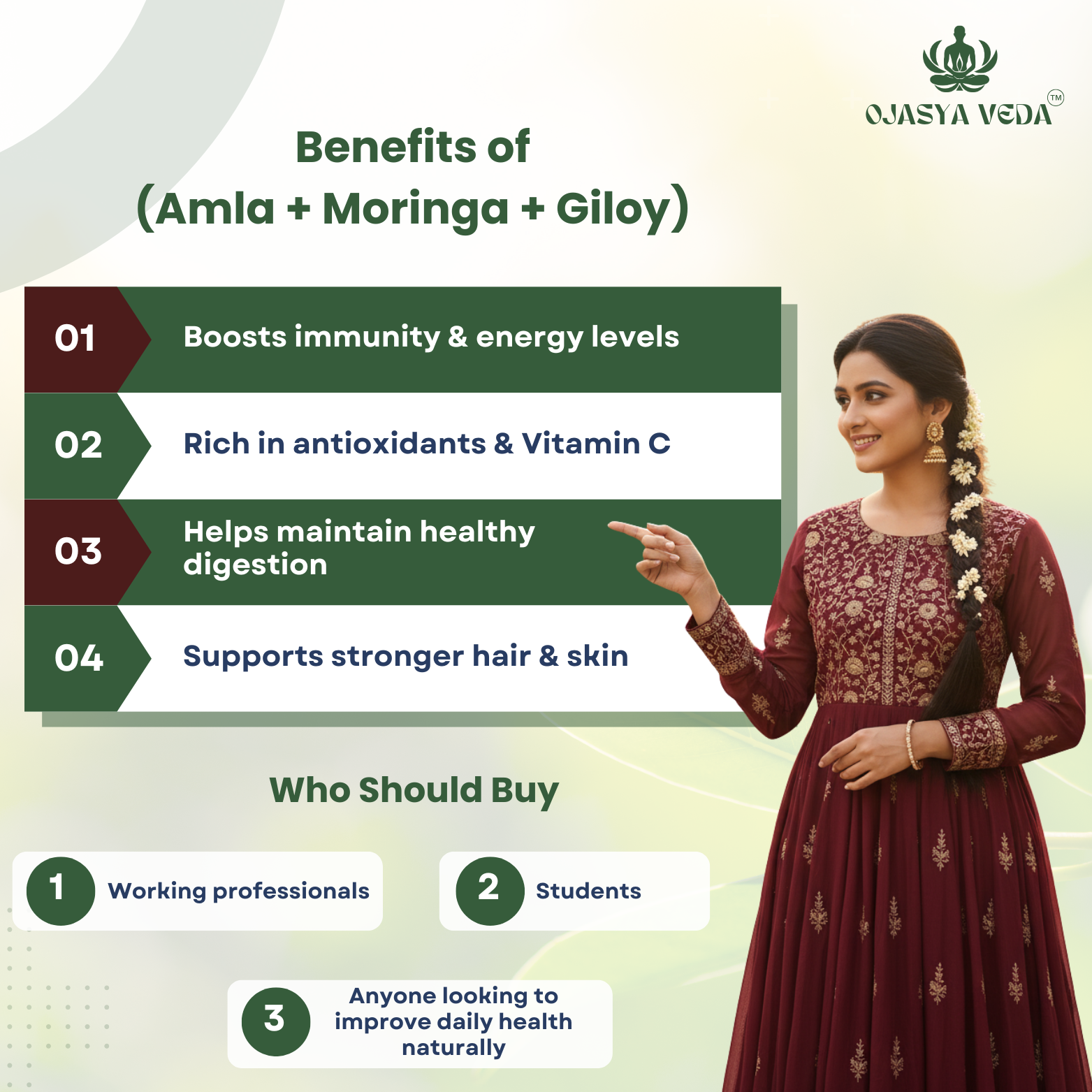 The Ojasya Veda Daily Wellness Combo brings together three powerful Ayurvedic herbs — Amla, Moringa, and Giloy — designed to strengthen immunity, improve digestion, increase daily vitality, and support long-term wellness.